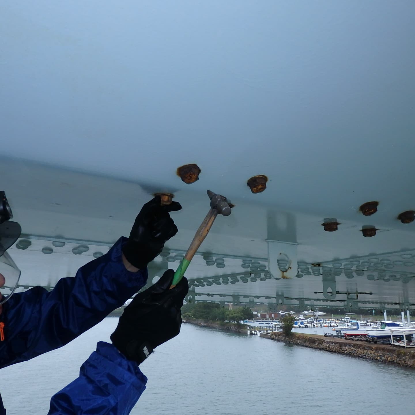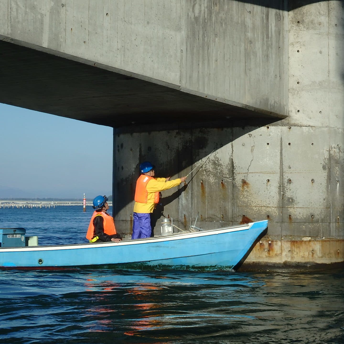 目視点検、たたき点検を中心に、高所作業車や橋梁点検車、場合によっては船上から調査を行うこともあります。