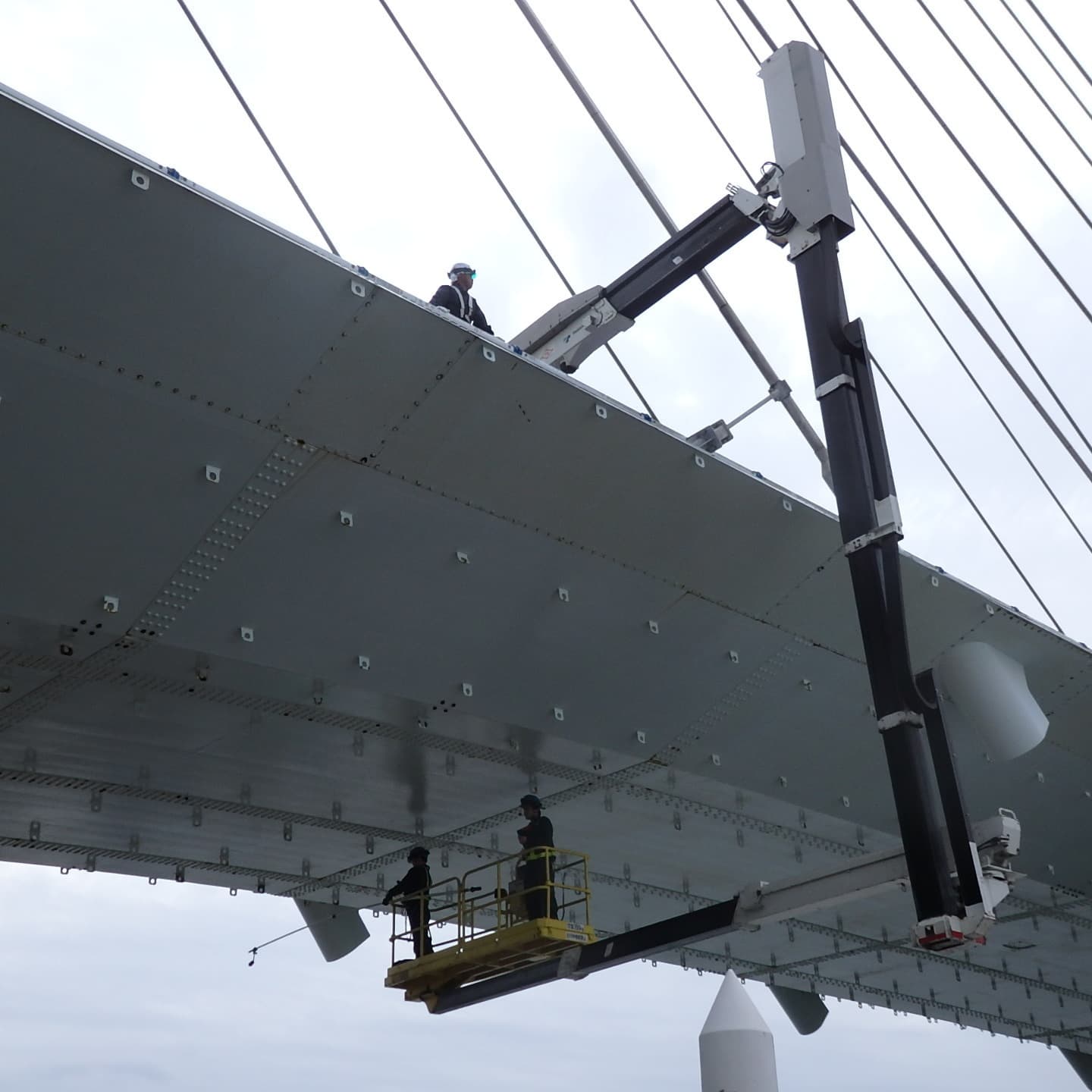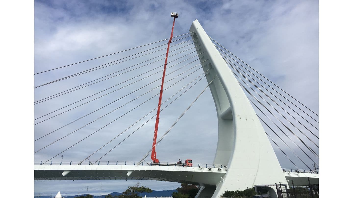 過去には、橋梁主塔部点検のため、国内最大級の高所作業車(最高床高54m)を使用したことも。